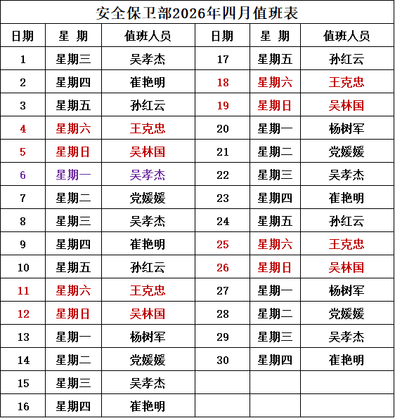 安全保卫部2026年4月值班表