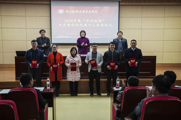张淼副书记宣读了《关于表彰2016年度创建“平安校园”先进集体和个人的决定》,法政分院、金融与经贸分院、学生工作部、图书馆四个先进集体的代表及崔南杰、秋懿婷等24位先进个人上台领取了荣誉奖牌和荣誉证书。